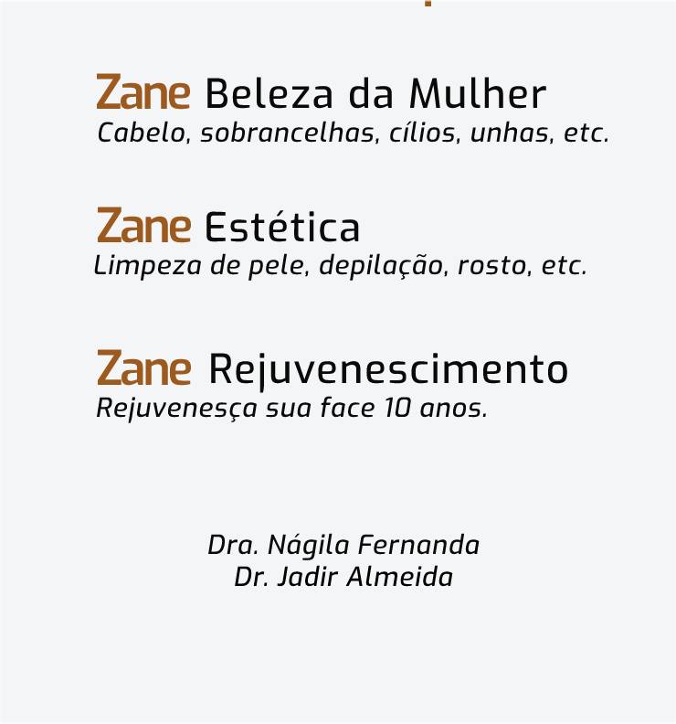 Na Zane, a qualidade é nossa marca registrada, desde tratamentos faciais rejuvenescedores até massagens relaxantes.